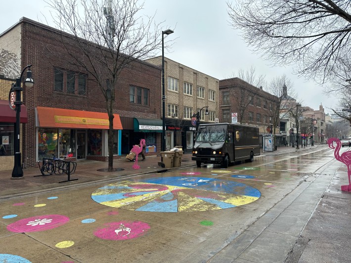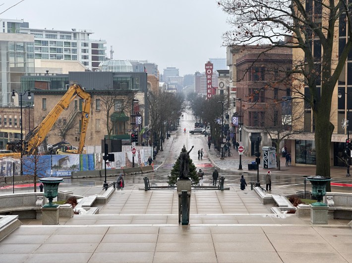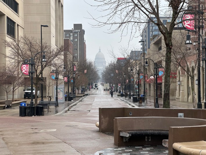 During my short visit to Madison, I rode the BRT twice, caught a typical bus route twice, and of course, walked. I started my journey at the First Street station and headed east through downtown, where the route winds around the capitol. I disembarked at the East Campus station on the University of Wisconsin Madison campus and headed over to State Street — which is pedestrianized except for the BRT routes and delivery vehicles — to find a burrito for lunch.