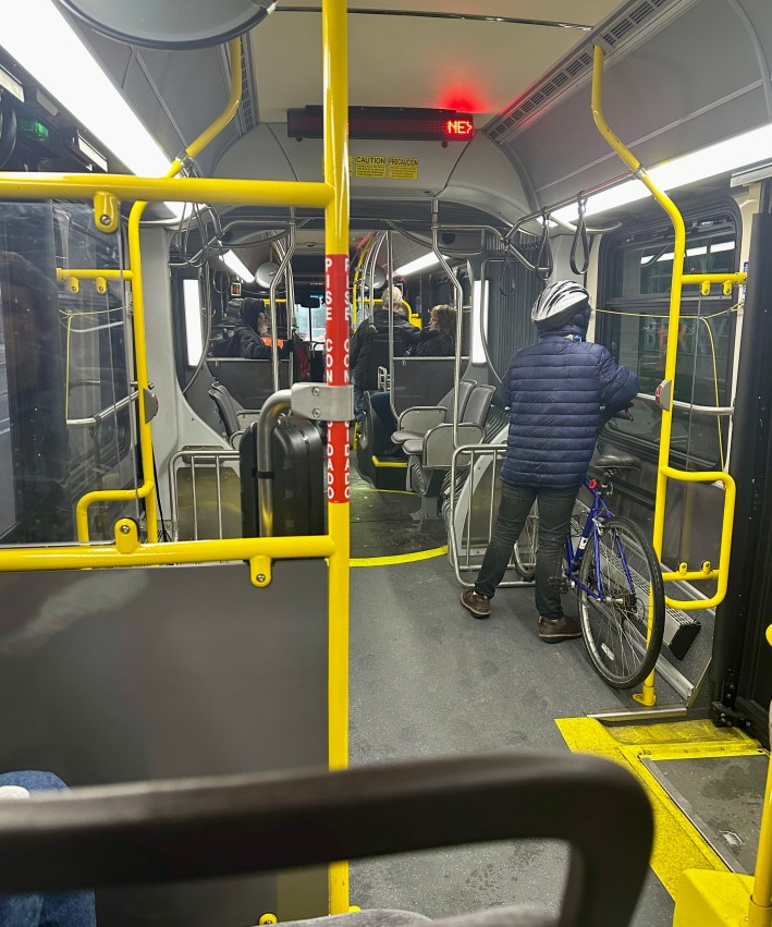 There was something else unique about the buses: passengers could bring their bicycles inside the vehicle and park them in a designated area that had a rack to secure bikes’ front wheels. Straps that looked like seat belts are used to hold the bike upright.