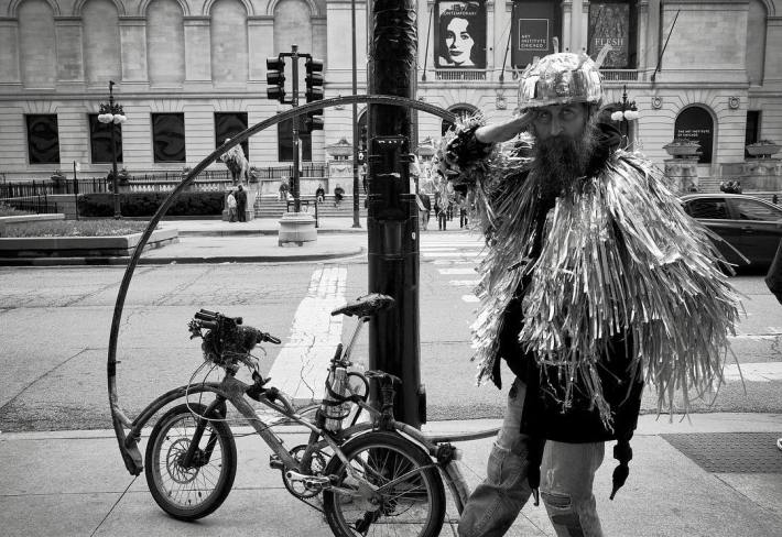 Often wearing his handmade fringed silver Mylar jacket and spiky helmet, Travis defied gravity and common sense by doing somersaults on his handmade “chopped” bike for tips, generally five bucks per roll. He was most often spotted at the bustling, six-way intersection of North, Damen, and Milwaukee avenues in the Wicker Park neighborhood.