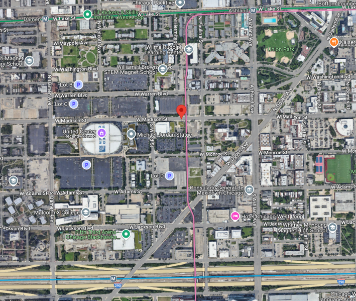 Of course, a lot has happened since then. The attractive new Damen Green station (re)opened last August, in time for the Democratic National Convention. That’s about 0.4 miles, or an eight-minute walk at 3 mph, from the main entrance to the arena. But a Pink Line station on Madison Street, shown with a red pin in the above map, would only be about half that distance from the stadium – super convenient.