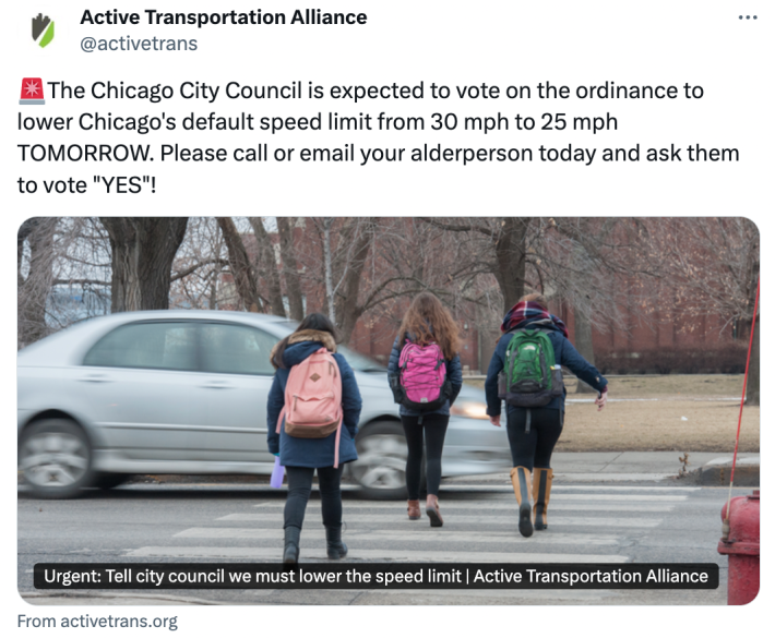 Here’s a statement on the vote from from Active Transportation Alliance spokesperson Ted Villaire. “We are deeply disappointed by the Chicago City Council’s failure to pass the ordinance reducing the citywide speed limit from 30 mph to 25 mph,” he said. “This decision represents a missed opportunity to improve street safety for all Chicago residents. Lowering speed limits is a proven method to reduce traffic fatalities and injuries. Cities like New York, Boston, and Seattle have already implemented similar speed limit reductions with positive results. In 2023 alone, there were over 9,000 crashes related to speeding in Chicago, totaling at least $1.1 billion in societal costs, according to the USDOT Benefit Cost Guidance analysis.”