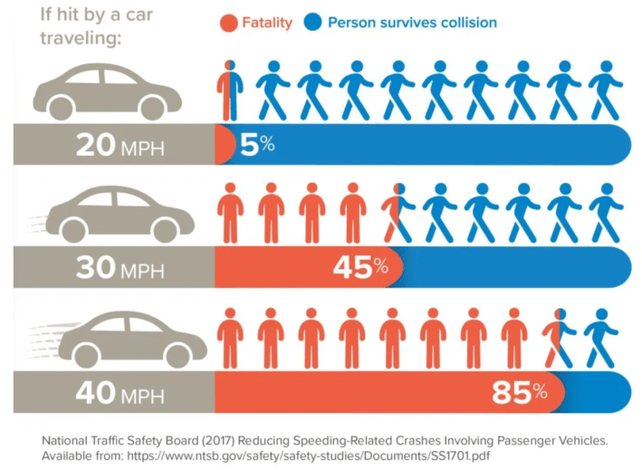 “Proponents of reducing the speed limit pointed to city data that shows a person struck by a vehicle traveling at 20 mph has only a 5 percent chance of dying β while that number grows to 40 percent at 30 mph,” noted Block Club’s Madison Savedra and Mack Liederman.