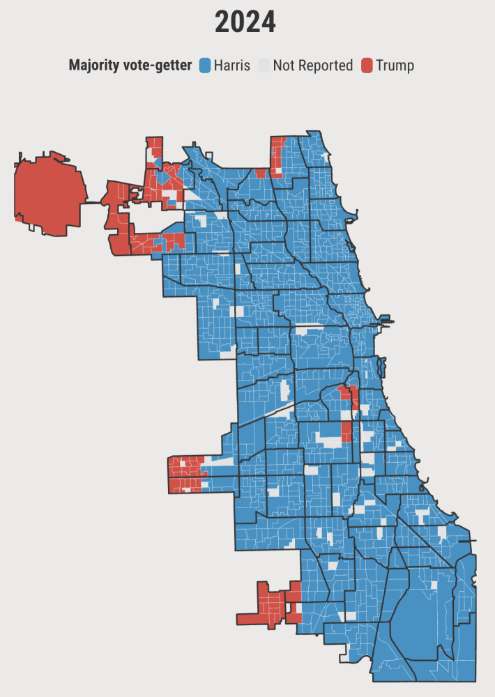 Community Areas where Trump won precincts (MAGA hat icons): Aside from Black Caucus members, many of the no votes came from alders whose wards include, or are very near, Community Areas containing some voting precincts where Donald Trump won a majority of the 2024 vote. Most of these areas are on the Far Northwest and Far Southwest sides.