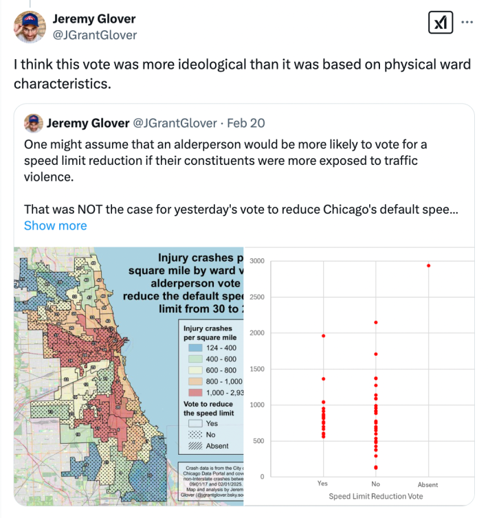 Update 2/22/25, 7:30 AM: Jeremy Glover, a safe streets advocate and skilled cartographer, had a similar perspective on the vote as I did, “This vote was more ideological than it was based on physical ward characteristics.” But I think he did a better job of framing that point than I did, with an elegant map and chart illustrating that alderpersons of wards with a high number of traffic injuries per square mile were more likely to vote against the lower speed limit. Check out his map and chart in detail on Twitter and Bluesky.