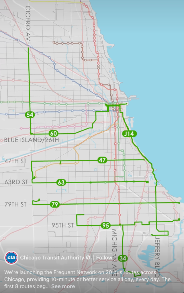 “This improvement in frequency is a transformative investment in our bus service and brings 10-minute or better service within a short walk of 2.3 million residents in our area all day, every day,” stated CTA Acting President Nora Leerhsen. “This is just one example of how strong transit funding availability allows us to provide the level of service our customers want to see.”