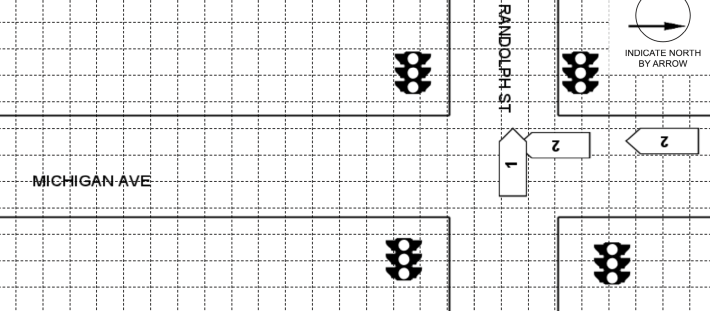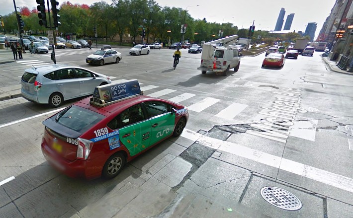 Christina Whitehouse, founder of the civic tech platform Bike Lane Uprising, noted to Struett that while Randolph/Michigan is next to Millennium Park, with high bicycle and foot traffic, it’s a hostile intersection for vulnerable road users. While Randolph has bike lanes heading to and from the lakefront trail, Michigan has ten mixed-traffic lanes. There’s no crosswalk on the south leg of the intersection, which means people walking from the Chicago Cultural Center at the southwest corner to the park at the southeast corner must cross three streets instead of just one.