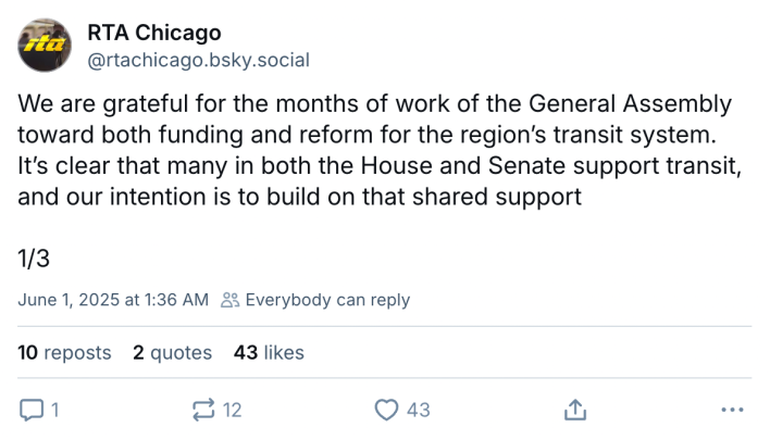 Update 6/1/25, 2 PM: Read the report from CapitalFax, probably the best source for state budget news, on Pritzker’s press conference about the budget this morning. We’ve highlighted the portions about transit on Bluesky and Twitter.
