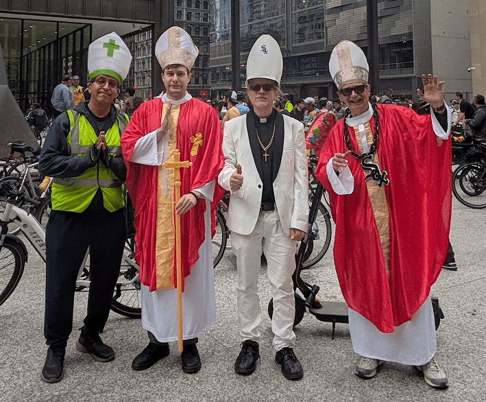 And the local craze over the new Vicar of Jesus Christ hasn't just involved involved t-shirts, keychains, and names for Italian beef sandwiches. Sustainable transportation advocates have gotten in on the action as well, as you can see from this photo from last month's edition of the Chicago Critical Mass bike parade/protest/party, dubbed "The Pope Mass."