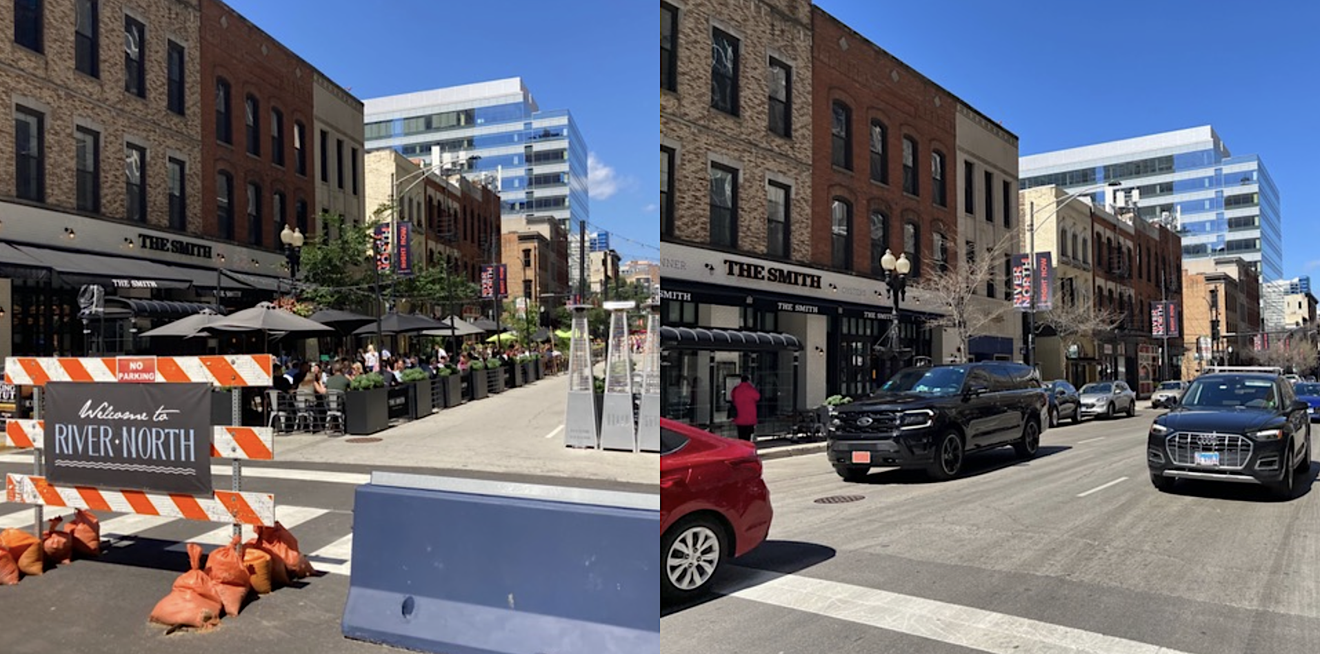 • Formerly car-free dining area (silverware icon): Clark Street between Grand Avenue and Kinzie Street in the River North nightlife area was completely pedestrianized during COVID-19 to make room for more outside dining. Unfortunately, due to pushback from some neighbors and restaurateurs on other nearby streets, the highly successful car-free district was reopened to motorized traffic in May 2024. However, dining establishments are still allowed to replace curbside parking spaces with seating areas during the warmer months.