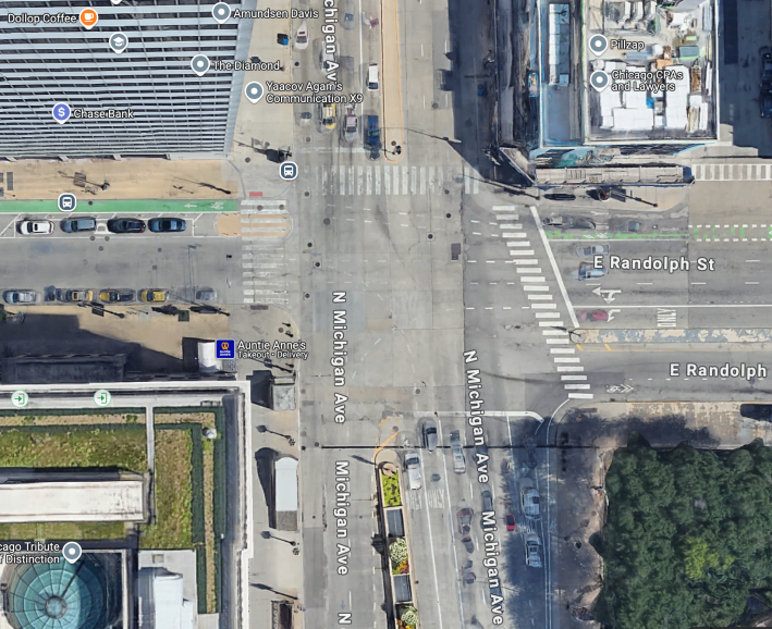 • Intersection of two protected bike lanes (bike icon): This is the junction of the Dearborn Street two-way protected bike lane, and the Randolph Street PBL. This is sort of a “protected intersection.” Prior to installation of the concrete protection, it was common for drivers to crash into Petterino’s restaurant at the northwest corner.