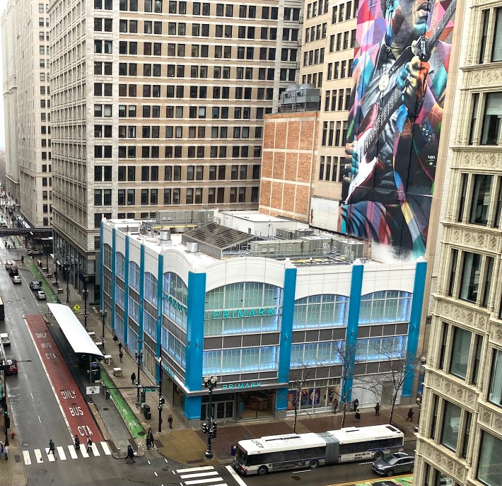 • Loop Link “bus rapid transit lite” stop (bus icon): Across the street from Daley Plaza, this is an example of one of several giant Loop Link stops on Washington and Madison streets, space roughly every two blocks.
