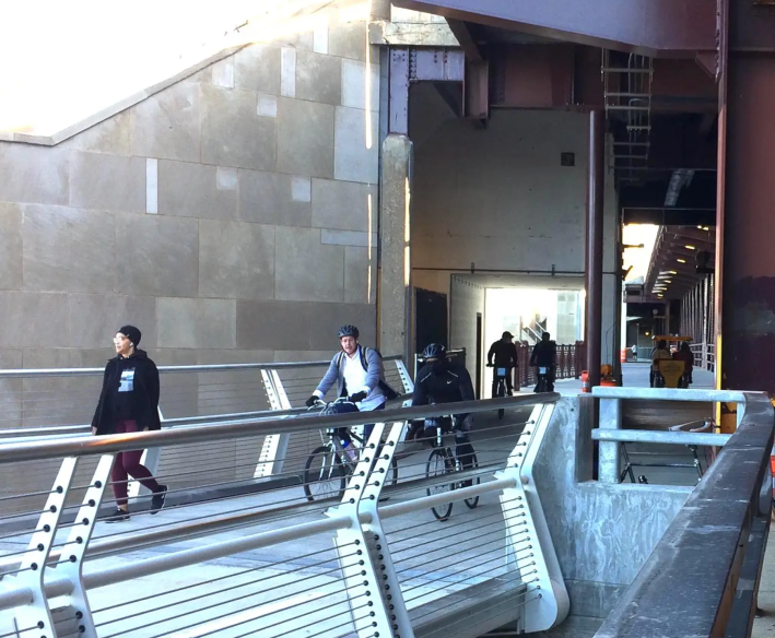 • Chicago Riverwalk (blue line): Completed in October 2015, the newest section of this walking and entertainment corridor runs from Michigan Avenue to Lake Street. Funded as a bike-pedestrian route, it now has a de-facto bike ban.