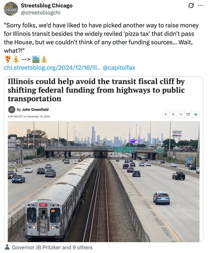 Sure, the tweet was kind of cheeky, but the logic was fairly sound. The link went to a December 2024 SBC article about how Pennsylvania Governor Josh Shapiro had recently “flexed” $153 million from in federal Highway Trust Fund money to Philadelphia’s SEPTA transit system. Green New Deal Network Campaigns and Political Director Saul Levin suggested that strategy might also work to help address Illinois’ pending $771 million transit fiscal cliff.