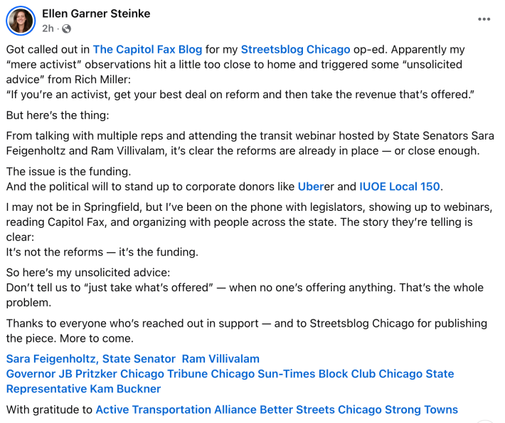 Update 6/17/25, 10:30 PM: Today the statehouse news website Capitol Fax ran a blog post supposedly debunking this guest op-ed . After publishing his piece, Capitol Fax Editor Rich Miller stated in his comments section that Streetsblog Chicago was “doing harm by spreading misinformation/disinformation.” Ellen Steinke, the author of this SBC article, provided a response to Miller’s criticisms, posted at the end of her piece. The Capitol Fax post seemed like a very odd turn of events, given recent interactions I’ve had with Rich, which I discuss at the bottom of this webpage. – John Greenfield, editor