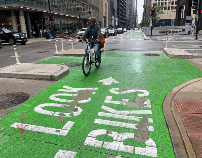 So we’ve got a fair amount of those in the loop nowadays. Recently, the Chicago Department of Transportation improved a lot of the bikeways by adding curb protection. Washington is a good route for getting eastbound across the Loop.