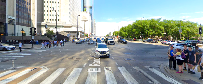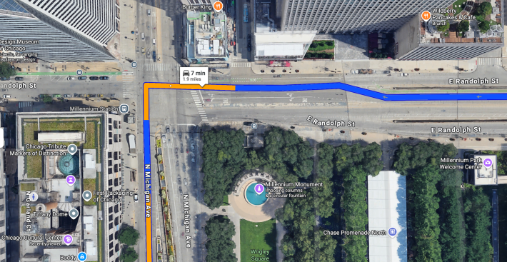 Another thing you might look at while you’re here, is what I call “Chicago’s Dumbest Intersection,” Michigan Avenue and Randolph Street. It’s a very dangerous intersection. Somebody was fatally struck on a Divvy bike-share bicycle there a couple weeks ago. Michigan is our main shopping street. Randolph is a bike route you can take to Lake Michigan and the Lakefront trail.