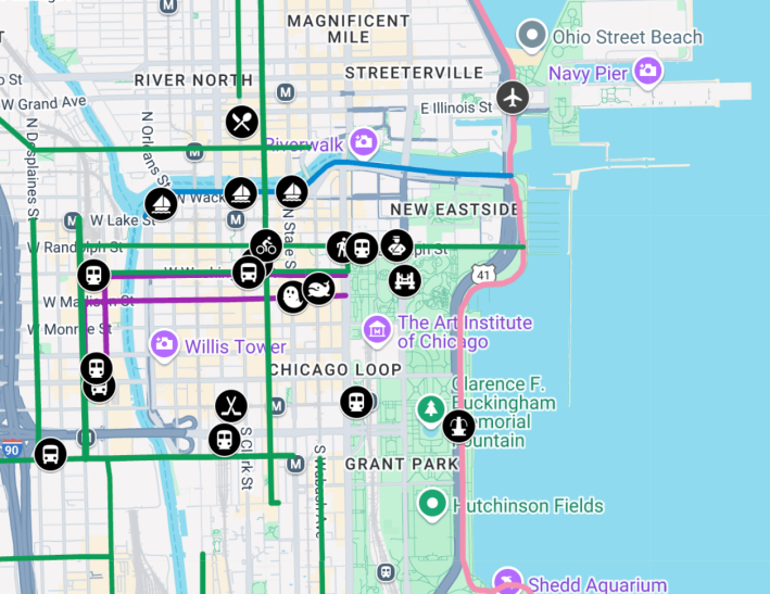 Teaching Professor Phil D’Anieri asked if Streetsblog Chicago could recommend some locations for the students to explore, so I put together an interactive map of walk/bike/transit hotspots in or near the Loop, basically the city’s central business district.