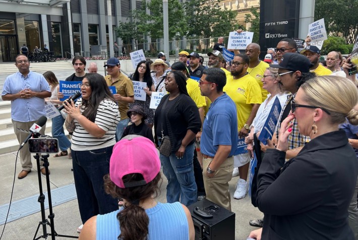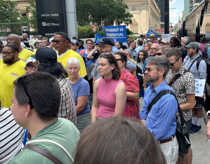 The event began a little late because station security personnel asked the organizers to move from Union Station property to the public sidewalk. “You do realize this is a rally to save transit?” one attendee asked a staffer incredulously. She nodded politely and directed the crowd to gather on Adams Street in the shade of the Fifth Third Bank Center.