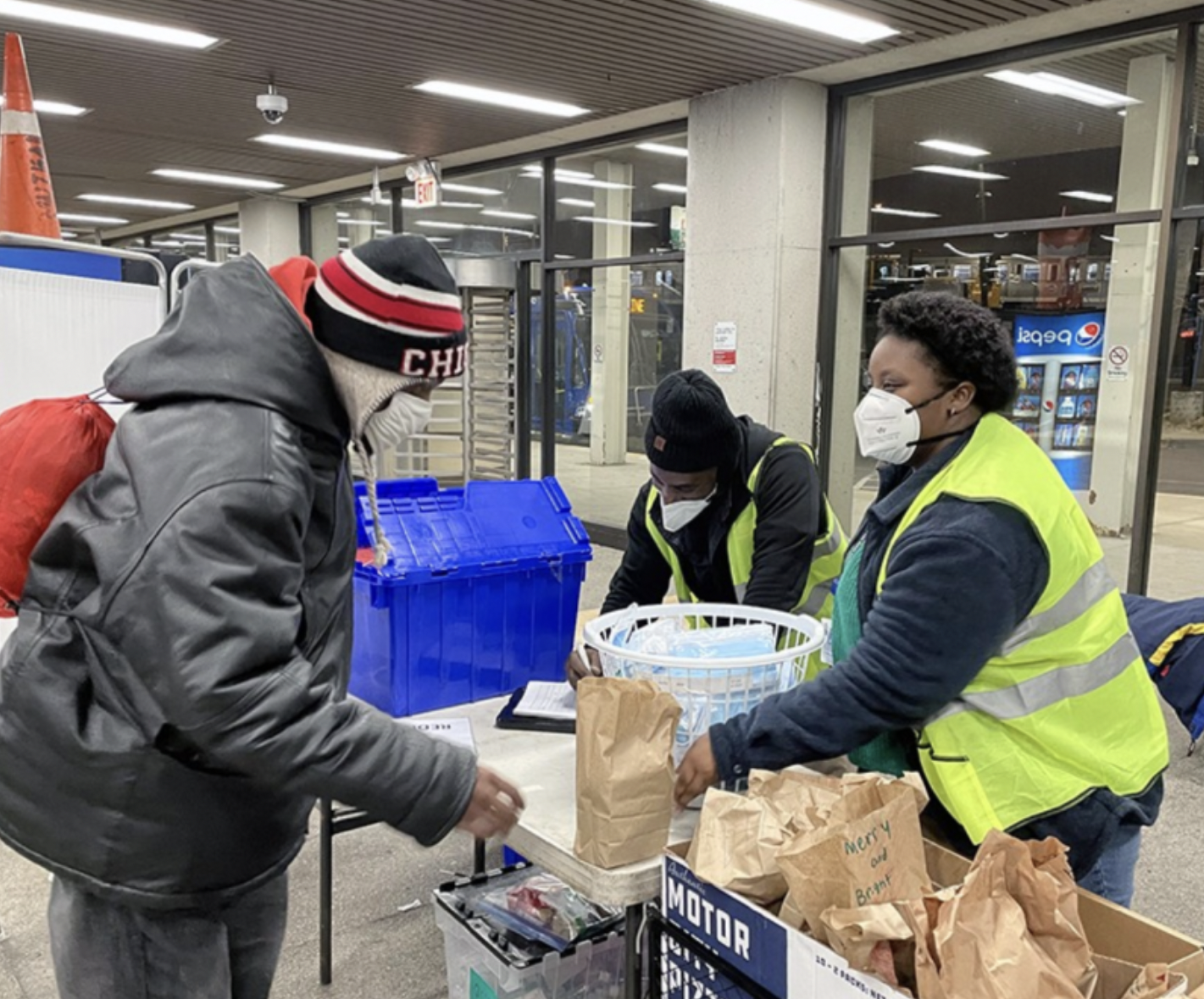 A resident receives a sack supper from Kyanna Johnson, an outreach worker for The Night Ministry, at a CTA Blue Line station. Photo: The Night Ministry