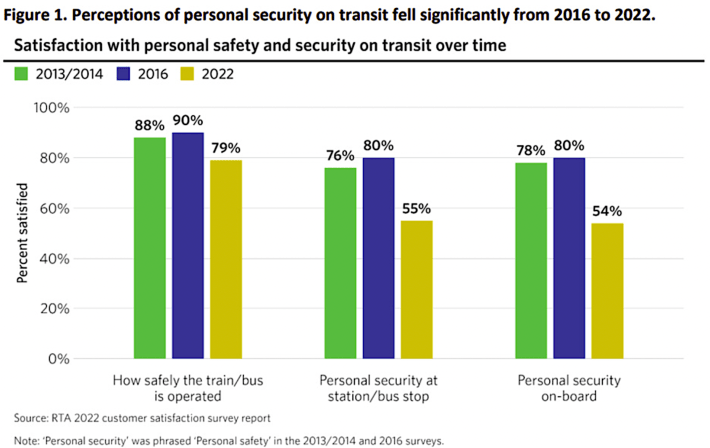 In addition to being dangerous and unpleasant, this is also a major threat to ridership. A 2019 reports from the Transit Center, which included focus groups of Chicago riders, noted that safety was the second most important ssue for riders. In Los Angeles, more than 80 percent of riders who stopped riding the LA Metro after Covid indicated that they didn’t believe the system was safe. This also means that the RTA’s 2022 survey data presents a wildly optimistic picture. If ridership has cratered in part due to safety, and only 54 percent of current riders think the system is safe, then the percentage of pre-pandemic riders who think the system is safe today is far lower.1