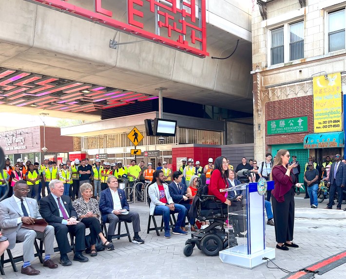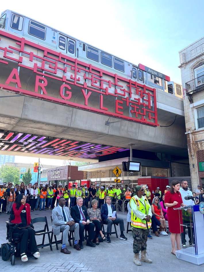“Lawrence, Argyle, Berwyn, and Bryn Mawr are now fully accessible,” Lee added. “Accessibility is deeply personal for me. The CTA is my go-to for getting around, and I usually take the bus. But that’s going to change, ’cause now we got more stations, y’all. These new stations open up a whole new part of the city.” She noted that it is particularly fitting that these stations opened during Disability Pride Month, and mentioned that 42 of the CTA’s 146 train stops are still not ADA accessible. “We’ve still got a long ways to go.”