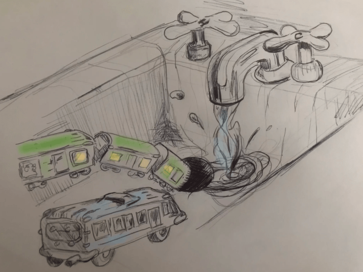 Will lack of funding for Chicagoland public transportation cause a “transit death spiral,” with service cuts sending ridership and revenue down the drain? Or will the Illinois Legislature step up to plug the budget gap? Illustration: Jonathan Roth