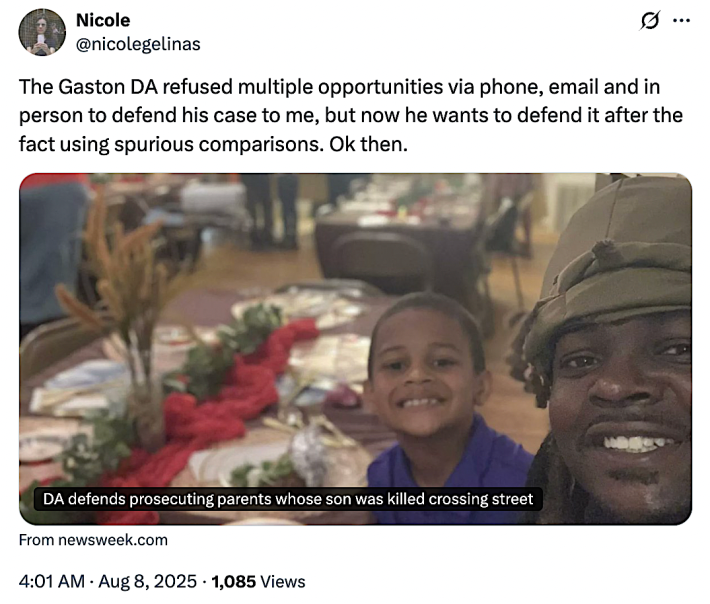 Long-time safe streets advocate Nicole Gilenas has an investigation of the case in the New York Times this week which is inspiring a lot of justified outrage about overzealous prosecution and street design failures, as well as the creeping criminalization of normal parenting decisions.