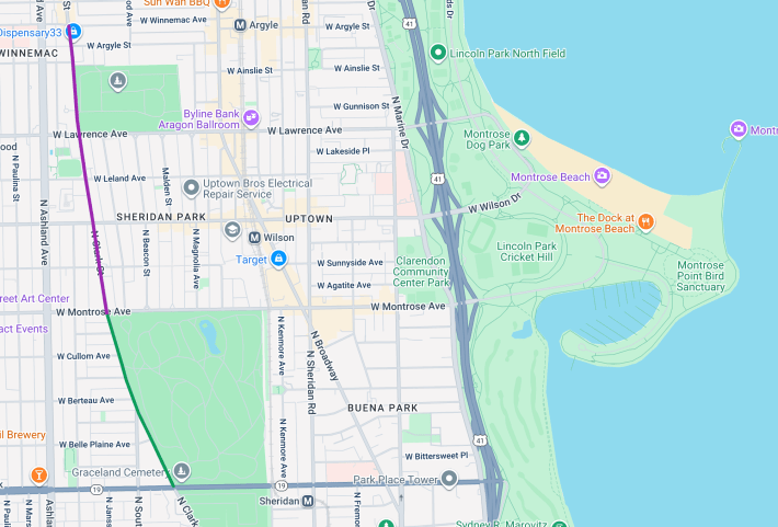 PFB used the 0.6-mile segment of protected bike lane on diagonal Clark Street between Irving Park Road (4000) and Montrose Avenue (4400 N.), next to historic Graceland Cemetery, aka the Graceland Greenway, as an example. “A protected bike lane on Clark Street begins and ends on a high-stress road, making it difficult to connect to other parts of Chicago’s bike network.”