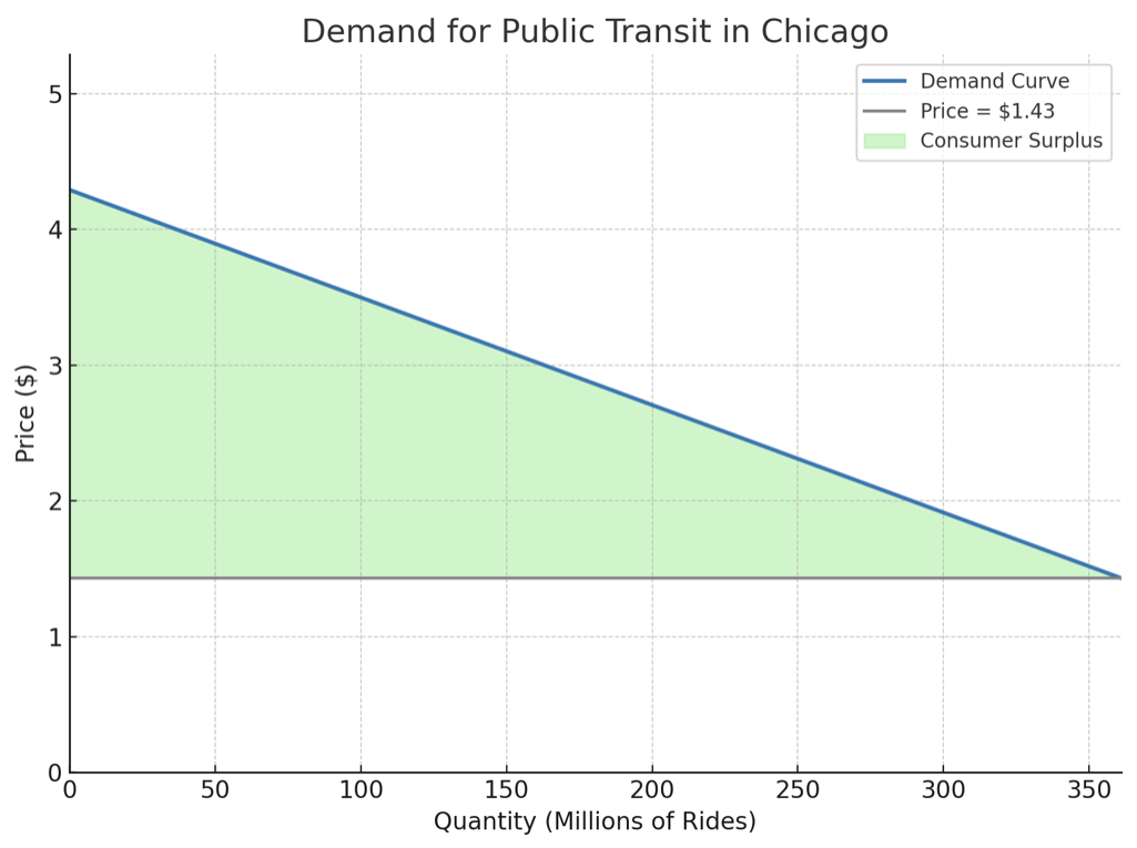 The shaded area represents consumer surplus: the amount of private value consumers get from riding transit left over after they pay the fare. In this case, the answer is $516 million. I want to emphasize the word “private” in private value here because, as we’ll see, most of the value of public transit comes from its social benefits.