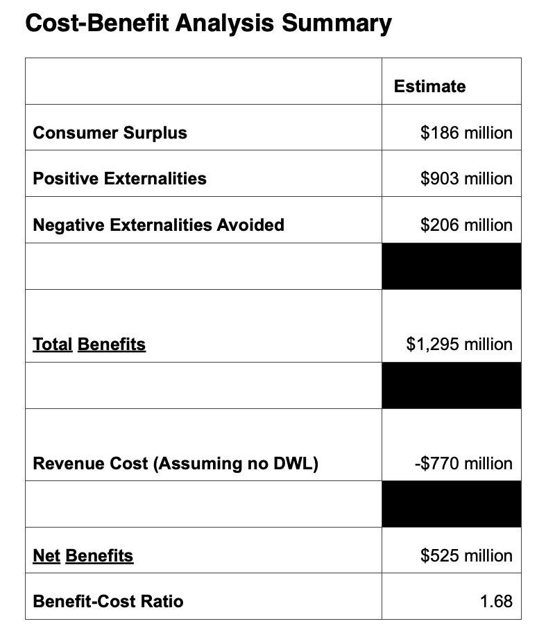 Public policy almost always requires some sort of tradeoff to make progress. Having a sober view of those tradeoffs, instead of burying your head in the sand and insisting that you can have your cake and eat it too, is a necessary trait for good policymaking and leadership. Occasionally, there will be times for when it’s an easy decision because the benefits of a policy are so overwhelming. As the table above makes clear, this is one of those times! In this extremely conservative estimate, benefits are almost 70 percent greater than the $771 million cost.