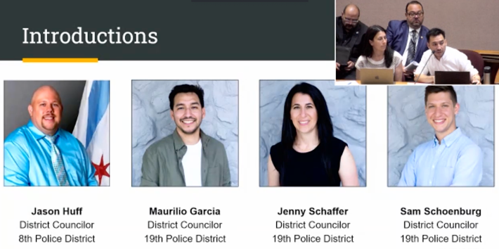 After that, there was a presentation on the research behind the proposal from some of the 8th and 19th District Councilors. “This proposal is really rooted in what we’ve been hearing from community members from when we really began this work in District Council,” said Jenny Schaffer, a North Center resident who represents the 19th District. “Things we’ve heard when we’ve been talking with community is around the need to add more civilians to the CPD workforce, and also thinking about how to implement alternate response models to make sure that police are more visible, either on foot or on bicycles. And there’s a clear desire to have 911 response times decrease, ensure beat integrity, and just bolster those interactions between officers and the communities that they serve.”