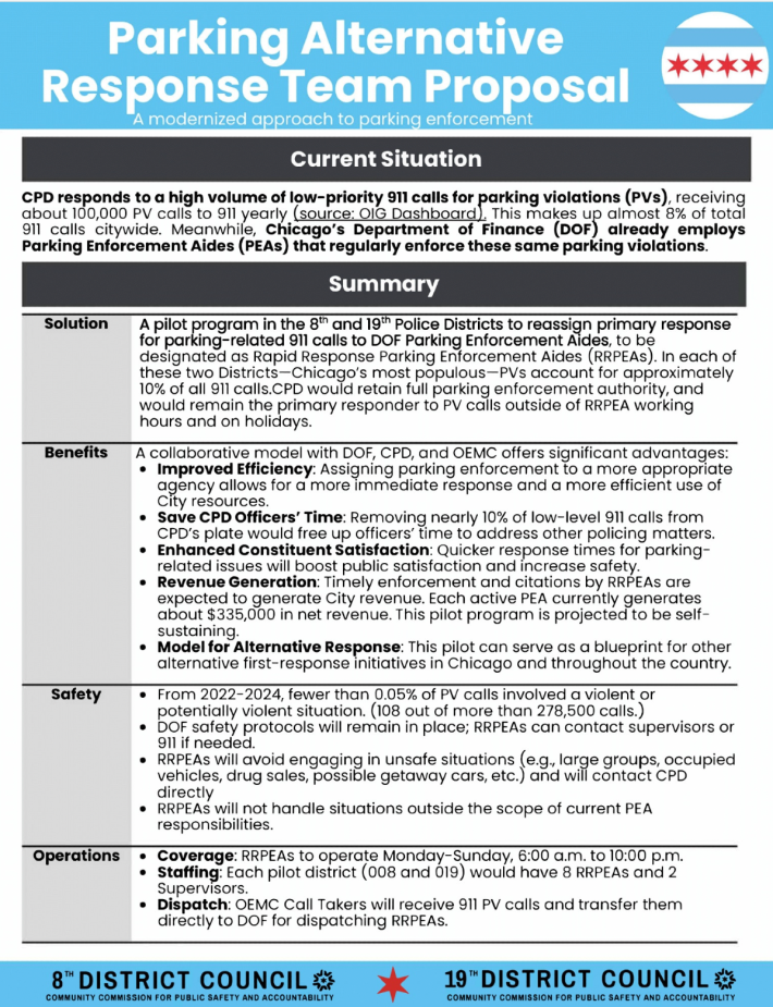 During the Q&A, several of the supporting alders voiced strong support for the proposal. “It’s a no-brainer,” said Ald. Curtis. “Like other wards, especially during school time, we get hit really hard with phone calls, with people blocking driveways and parking in the alleys to take the kids in school. This can alleviate all of that, while the police do their job.”