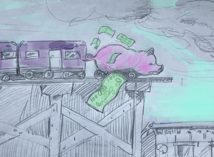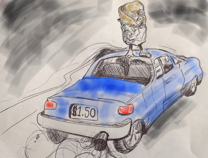 The HB 3438 transit governance and revenue bill includes a $1.50 “climate impact fee,” which Streetsblog has nicknamed the “burrito taxi tax,” on retail and restaurant deliveries, not including medicine and groceries, made by motor vehicle. Illustration: Jonathan Roth