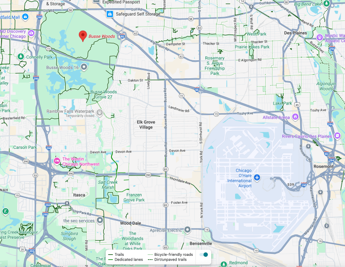 It’s one of a dozen local regions that are being analyzed with the goal of filling in bike network gaps, as suggested in the county’s 2023 Cook County Bike Plan. The O’Hare study includes portions of Bensenville, Chicago, Des Plaines, Elk Grove Village, Franklin Park, Mount Prospect, Park Ridge, Rosemont, and Schiller Park.