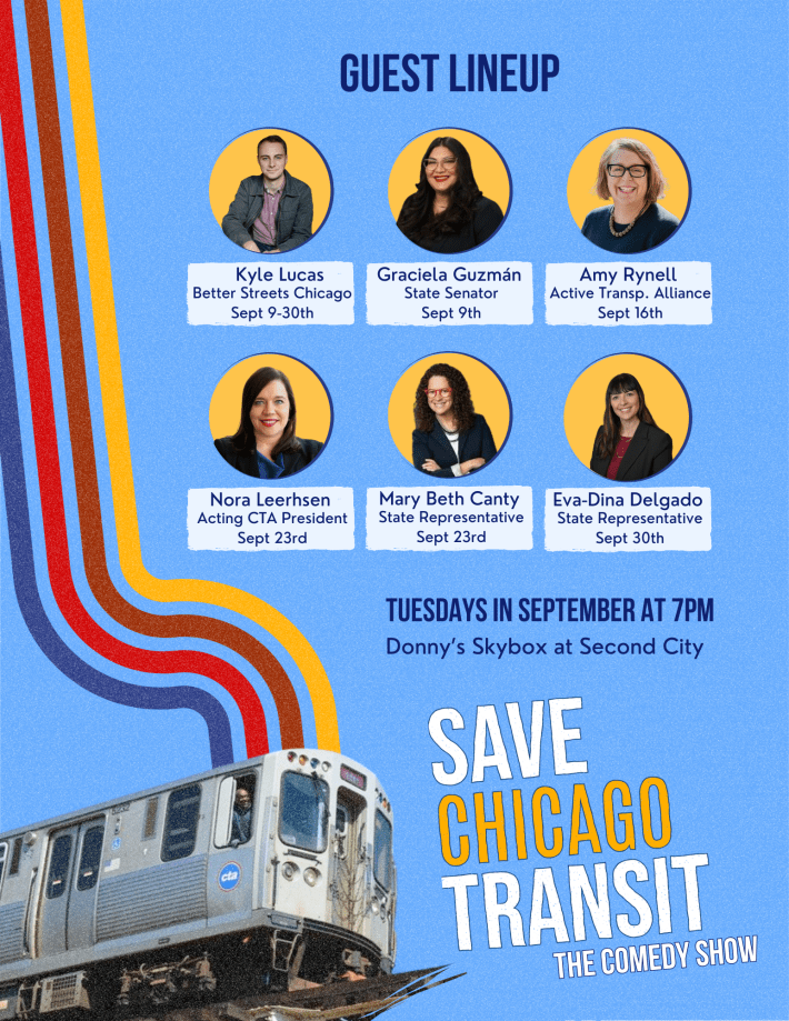 “Save Chicago Transit: The Comedy Show”, presented by Funny You Should Care, is a production that combines sketch comedy, improv, and interviews. It takes place Tuesdays in September at 7 p.m. at Donny’s Skybox theater at Second City, 1608 N. Wells St. in Old Town.