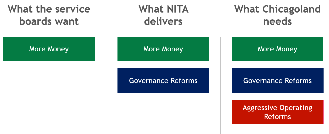 We can’t go over the cliff. But I’d much rather keep the pressure on a newly constituted Northern Illinois Transit Agency to continue to improve, rather than writing the biggest possible check in the short term. It’d be great to route an additional $1.5B flow into a high performing, integrated regional transit system – but if we write that check today, I worry that it’s less likely that we get to that outcome.