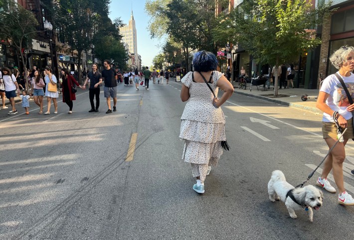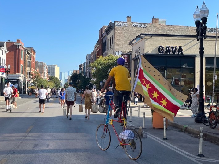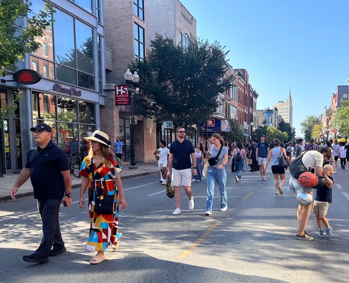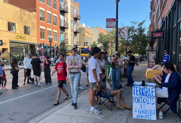 In late August, Quetzal Kilgore and I produced a post about the wildly successful debut of the three monthly Meet Me on Milwaukee car-free street events in Wicker Park. The series is pedestrianizing a 0.7-mile diagonal segment of Milwaukee Avenue for car-free walking, browsing, and relaxing from noon to 5 p.m. on the the last Sunday of the month. It’s organized by the 1st Ward and the Wicker Park Bucktown Chamber of commerce, with help from the Chicago Department of Transportation. I’m guessing the last one this year on October 26 will include some fun pre-Halloween vibes.