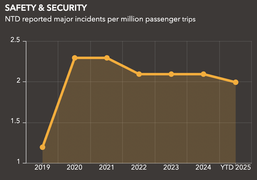 Molinaro’s first sentence about “the escalating violence [emphasis added] in and around Chicago’s transit system” is inaccurate. I realize that his boss had a problem with escalation recently. But, despite a spike in the number of major CTA safety and security incidents reported per million passenger trips during COVID, when ridership plummeted, that figure has actually been declining in recent years.