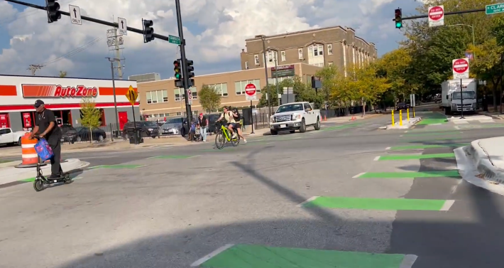 Now take a look at the clip I filmed yesterday, riding the same route, at around the same time of year, in similar weather, a few minutes before the evening rush, with the new greenway. There appears to be significantly less motor vehicle traffic, but more people riding bikes and e-scooters. And I didn't notice any major aggravation from drivers, other than one motorist who honked at me (3:15 in the video) while they were trying to exit a parking lot. But that didn't have anything to do with the greenway layout.