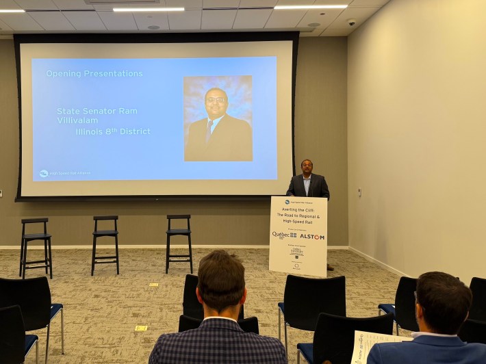 Fortunately, one of the other key players in the current Springfield transit egislation drama was waiting in the wings, and he even happens to have a rhyming first name. Sen. Ram Villivalam, sponsor of the public transportation bill HB 3438 served as understudy for this event. Hosted by the High Speed Rail Alliance, it took place at the 120 S. Riverside building in the West Loop.