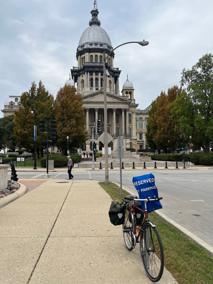 This morning, I pedaled a few blocks from my very cheap motel to the capitol. When I arrived, I was flattered to see that champions of the transit reform/funding effort in the General Assembly had reserved a secure bike parking space for me in front of the building.