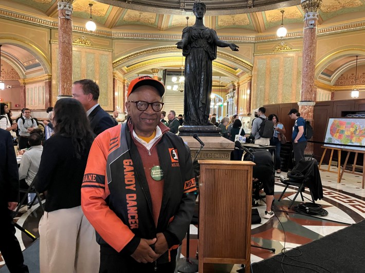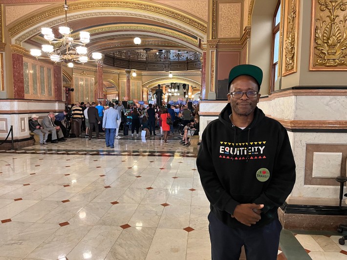 Again, I’m joking here. But there was definitely a who’s who of Chicago walk/bike/transit advocacy heavy-hitters present in the capitol, so I did some mini-interviews. As soon as I got through the metal detector, I was greeted by Oboi Reed founder of the mobility justice nonprofit Equiticity.