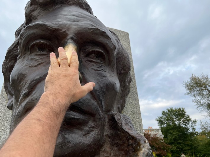 In contrast, after I’d typed up most of this article on a card table in a corner of the capitol, my work in Springfield was largely done. But I had one more item from my bucket list for this sub-24-hour visit. I bicycled about two miles north of the capitol to Lincoln’s Tomb and rubbed the nose of his large bronze head for good luck, a local tradition.