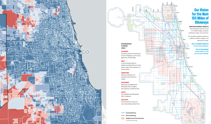 On the other hand, some parts of the Far Southwest and Far Northwest Sides that have virtually no bikeways aren’t particularly economically disadvantaged. But this absence does correlate with with high numbers of Trump voters.