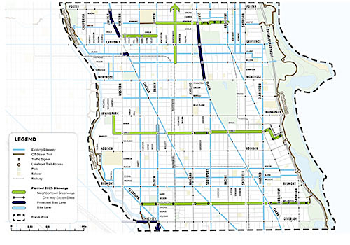 Check out the Chicago Department of Transportation’s Mid Northeast Project Area map, covering the nine-square mile region between Foster (5200 N.) and Diversey (2800 N.) avenues, the Chicago River, and Lake Michigan. It shows existing, in-progess, and upcoming bikeways in some or all of the North Center, Lakeview, Uptown, Lincoln Square, and Edgewater community areas.