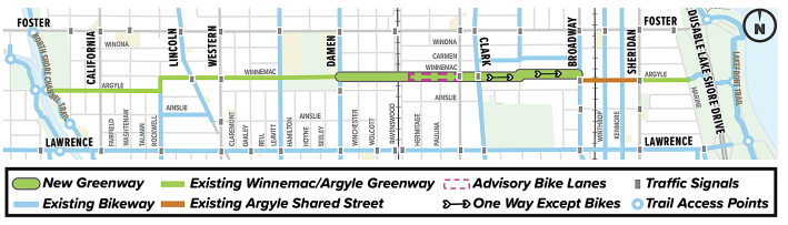 There was already a Neighborhood Greenway on Argyle and Winnemac from the river to Winnemac Park (which is located between Leavitt and Damen). An eastbound contraflow lane between California (2800 W.) and Rockwell (2600 W.) avenues is currently missing due to street repaving, but I assume it will be re-striped soon.
