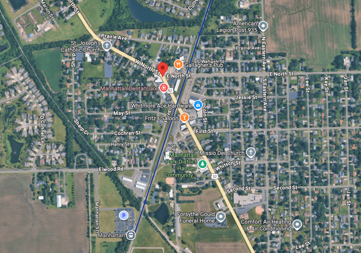 Manhattan is a town of roughly a thousand residents. It’s located about 43 miles from the Chicago Loop, at the outbound terminus of Metra’s SouthWest Service route.