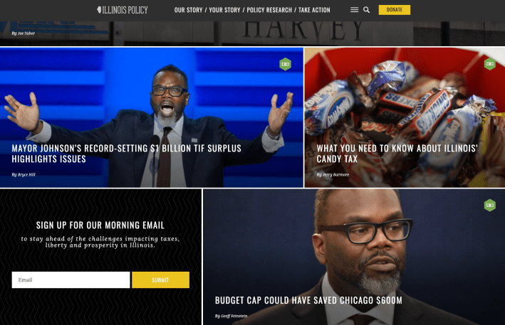 If you weren't already convinced that the Illinois Policy Institute think tank is an alarmist right-wing organization, just check out the homepage of their blog. The headlines are screaming at you in all caps. And they seem to carefully select the most unflattering screenshots possible of progressive leaders such as Chicago Mayor Brandon Johnson, a strategy right out of the Fox News playbook.