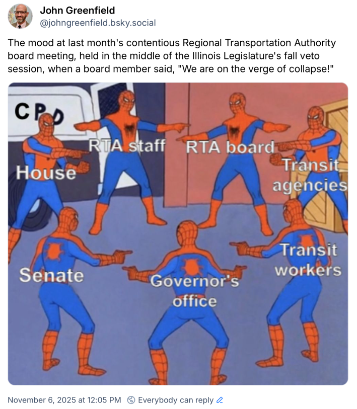 The October 23 Regional Transit Authority board meeting, in the midst of Springfield’s fall veto session on the brink of the transit fiscal cliff, was a contentious affair. It was basically a Spiderman Pointing Circle of people blaming each other for the dire straits Chicagoland transit was facing.