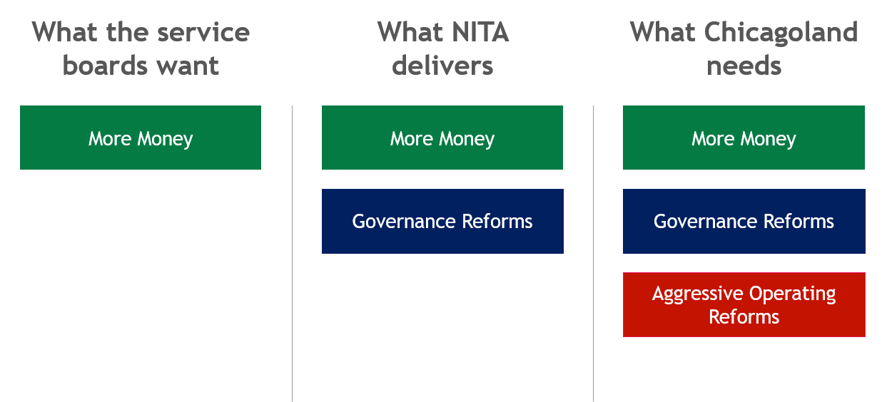 Second, the bill provides $1.5 billion in annual funding to both address a looming fiscal cliff (currently about $230 million and estimated at $700 to $800 million in coming years ) and improve service. It also does so with a healthy degree of fiscal sense. The majority of the funding comes from redirecting the state’s existing motor fuel tax to transit (providing about $860 million), dedicating interest on the state’s Road Fund to transit (roughly $200M in revenue) and permitting a 0.25 percent increase to the Regional Transportation Authority's local sales tax. I don’t love that last piece, but it’s a much better approach than many of the other ideas floated.1